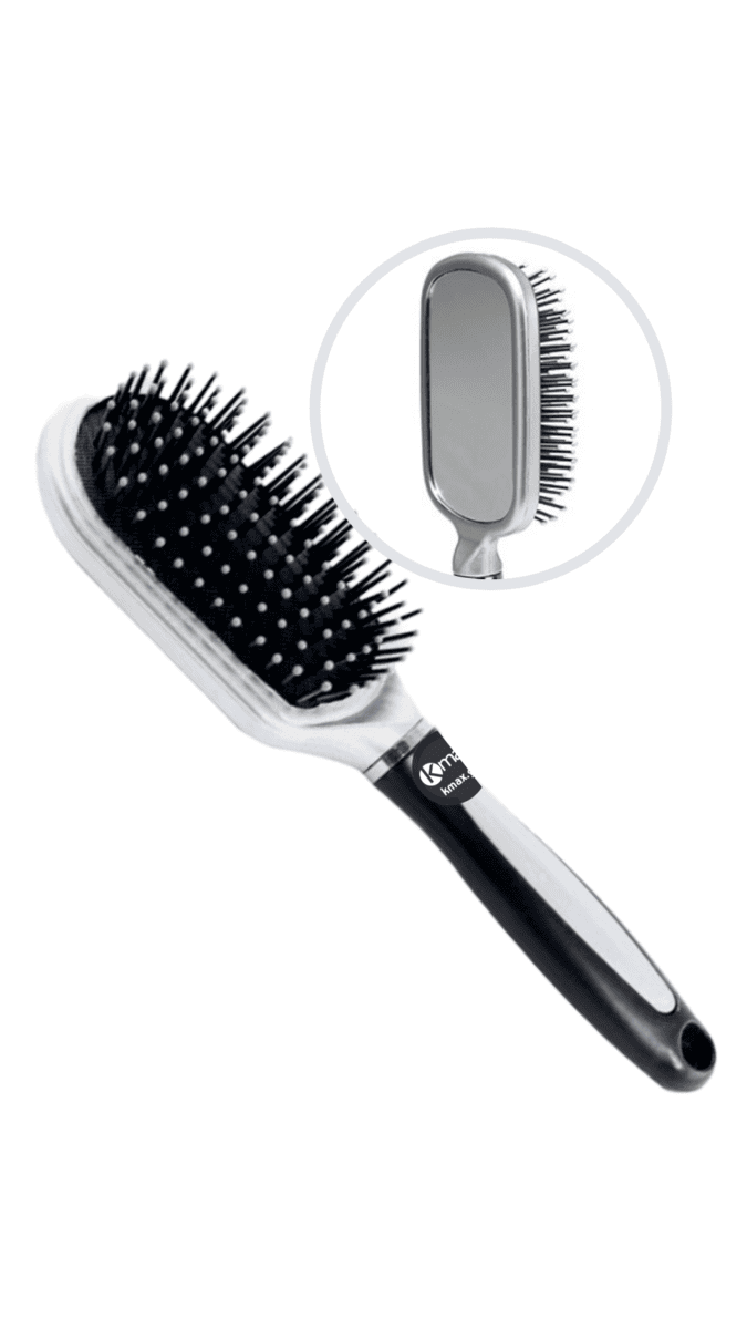 Η Kmax mirror hairbrush είναι ιδανική για απαλή περιποίηση όλων των τύπων μαλλιών σε όλα τα μήκη. Οι νάυλον ακίδες της είναι εύκαμπτες και τοποθετημένες σε ένα μαξιλαράκι από φυσικό καουτσούκ. Οι ακίδες καταλήγουν σε ένα σφαιρίδιο για να μην τραυματίζουν το τριχωτό της κεφαλής κατά το βούρτσισμα και για να διεισδύουν ευκολότερα μέσα από τα μαλλιά. Χρησιμοποιήστε τον καθρέπτη στην πίσω πλευρά της βούρτσας για να εφαρμόσετε σωστά τις μικροΐνες μαλλιών στη κορυφή και στις πίσω αραιωμένες περιοχές.